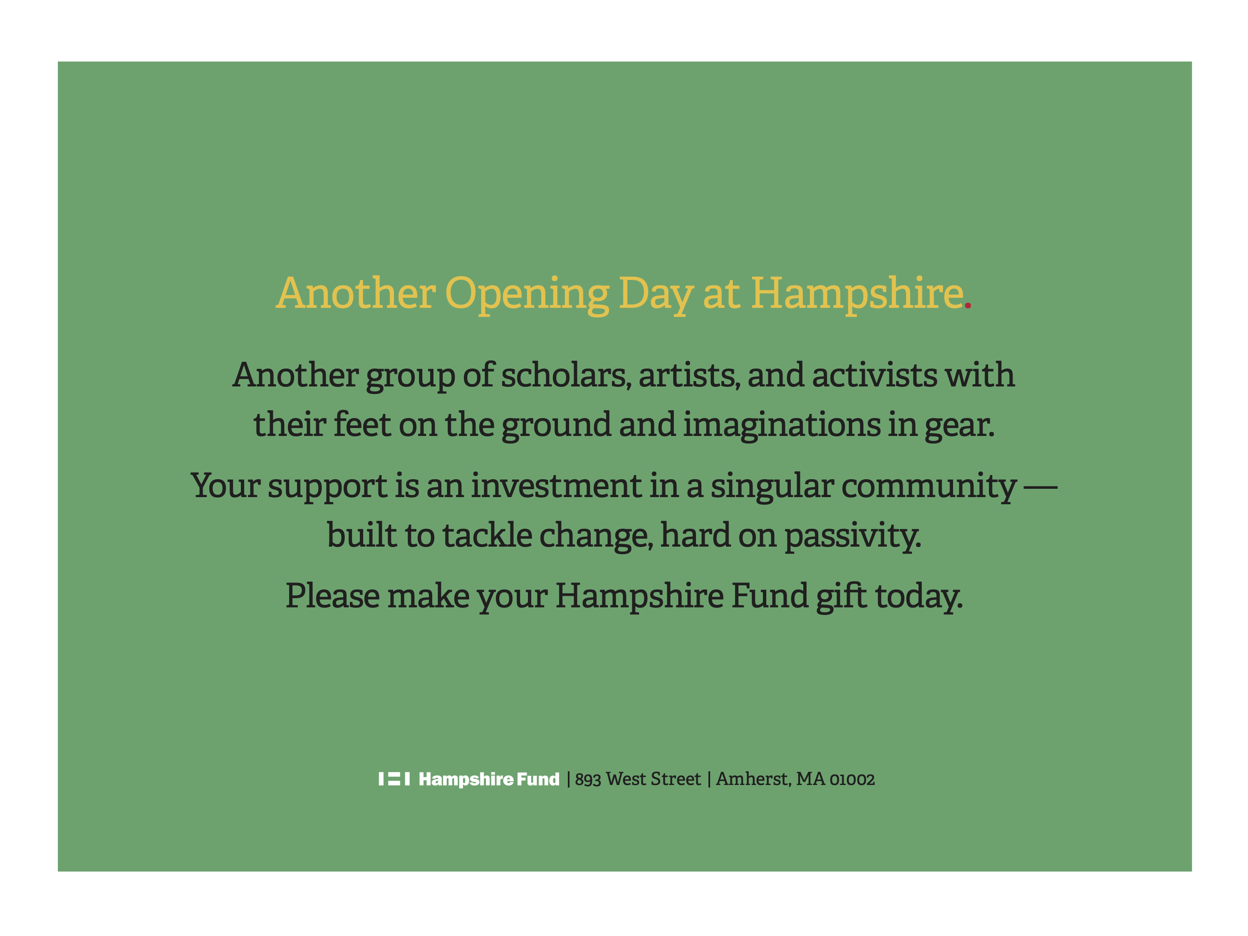 Yellow Shoes drew an audible gasp from the board when I presented this annual fund postcard along with other works from our previous quarter. The trustees felt Hampshire in that moment. I responded that it’s our job to capture the spirit of the place and its people in everything we do. I created the concepts and wrote the text for both pieces below.