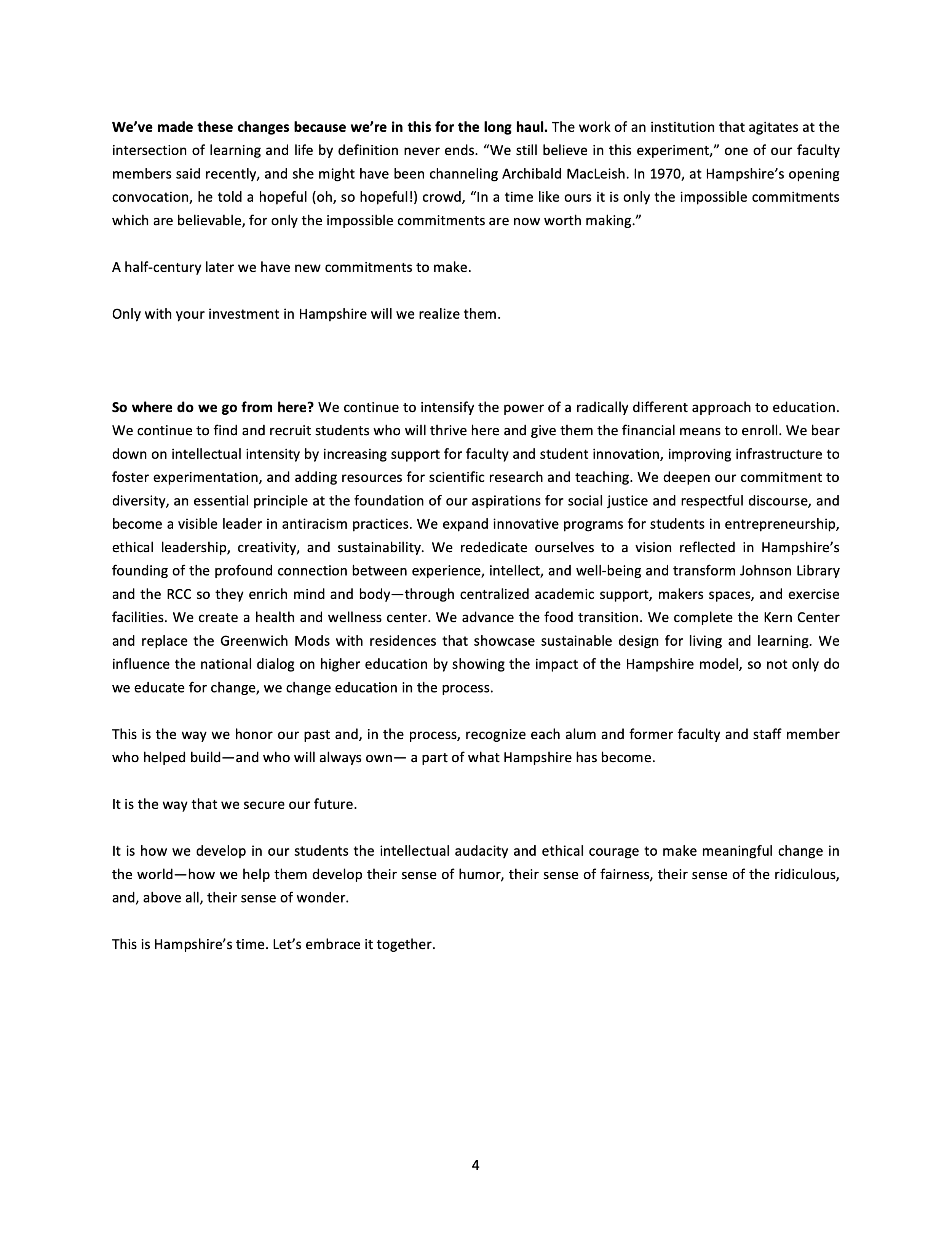 When I arrived, Hampshire had on the shelf a half dozen iterations of the case, each missing the mark. So, the president asked me to write it. My version below jump-started a languishing campaign. Many of the words and concepts already existed in the president’s various speeches—they just needed to be woven into a comprehensive argument. After reading this text, colleagues told me that they had heard these themes for years, “and now we know how they all fit together.”